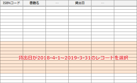 まず、貸出表からISBNコードで絞り込むと、次のように対象のISBNコードをもつレコードの貸出レコード一覧となります。