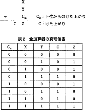 - 下位からのけた上がりCinを考慮して1ビット同士を加算する全加算器の真理値表を,表2に示す。