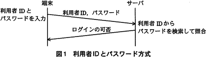 端末は,利用者が入力した利用者IDとパスワードをサーバに送信する。サーバは利用者IDから登録されているパスワードを検索し,送信されたバスワードと照合することによって,ログインの可否を応答する。利用者IDとパスワード方式を図1に示す。