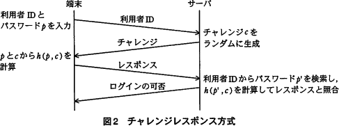 端末は,利用者が入力した利用者IDをサーバに送信する。サーバは,利用者IDを受信すると,ランダムに生成したチャレンジと呼ばれる値 c を端末に送信する。端末は,利用者が入力したパスワードpとチャレンジcから,ハッシュ値h(p,c)を計算して,レスポンスの値としてサーバに送信する。サーバは,利用者IDから登録されているパスワードpを検索し,端末と同じハッシュ関数hを使って計算したハッシュ値h(p',c)とレスポンスの値とを照合することによって,ログインの可否を応答する。ここで,ハッシュ関数hは公知のものであり,どの端末でも計算可能とする。チャレンジレスポンス方式を図2に示す。