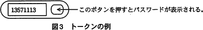 利用者には,自身の利用者IDが登録されたトークンと呼ばれるパスワード生成器を配布しておく。トークンの例を図3に示す。