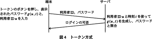なお,トークンの時刻とサーバの時刻が同期していることは保証されており,トークンのパスワード表示からサーバにおけるパスワード生成までの遅延も,一定の時間は許容する。トークン方式を図4に示す。