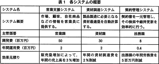 日用品メーカーであるT社の売上高は年間4,000百万円,製品の製造に要する資材の調達費(以下,資材調達費という)は年間2,000百万円である。T社の企画課では,開発を予定している営業支援システム,資材調達システム,契約管理システムの効果を見積もることになった。各システムの概要を,表1に示す。