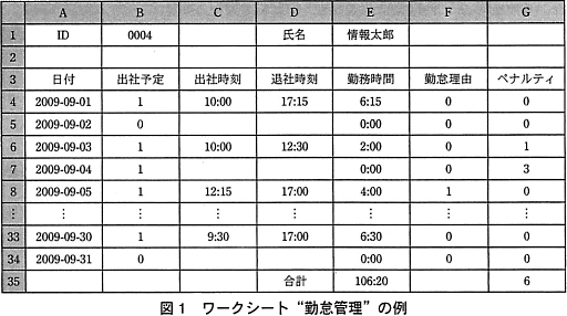 - 表計算ソフトのワークシート"勤怠管理"を作成した。その例を図1に示す。