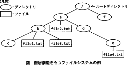 階層構造をもつファイルシステムにおいて,ファイルやディレクトリを 特定する文字列をパスという。ルートディレクトリを基準としたパスを絶対パスと呼び,"/"から始まり,各階層を"/"で区切っていく。与えられたパスがディレクトリのとき,最後の"/"はあってもなくてもよい。例えば,図のディレクトリeの絶対パスは "/a/d/e"又は"/a/d/e/"で示す。