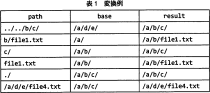 - path が相対パス表記であれば,base を基準にした絶対パス表記に変換し,result に格納する。path が絶対パス表記であれば,result には base に関係なくpathをそのまま格納する。