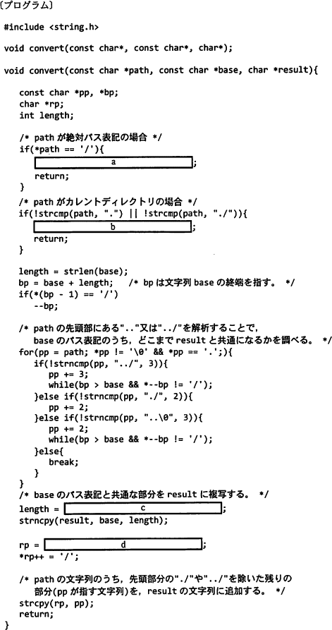 表2の引数列で関数 convert を呼んだときのプログラムの動作について,表2中の に入れる正しい答えを,解答群の中から選べ。ただし,プログラム中のa~dには正しい答えが入っているものとする。
