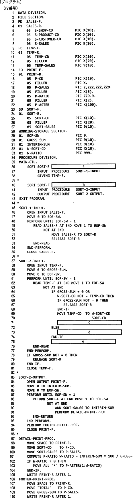 次のCOBOLプログラムの説明及びプログラムを読んで,設問1,2に答えよ。