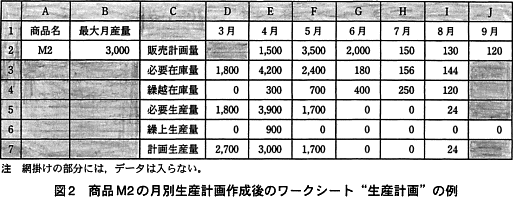 - 図1のワークシート"販売計画"を基に,商品M2について3~8月の半年分の月別生産計画を作成したワークシート"生産計画"の例を図2に示す。