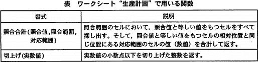繰上生産量とは,当月の必要生産量と翌月の繰上生産量の合計から,当月の計画生産量を差し引いた数量である。 - ワークシート"生産計画"で用いる関数を表に示す。
