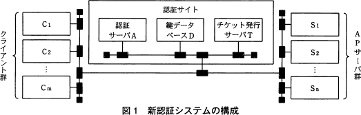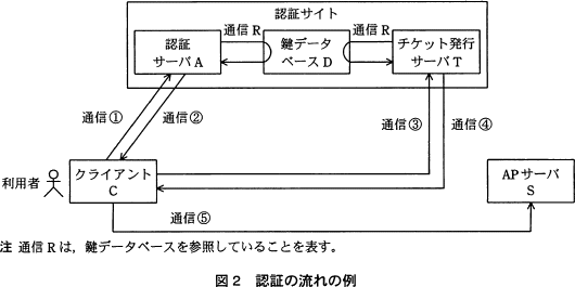 - 認証サイトは,認証サーバ,鍵データベース及びチケット発行サーバで構成する。