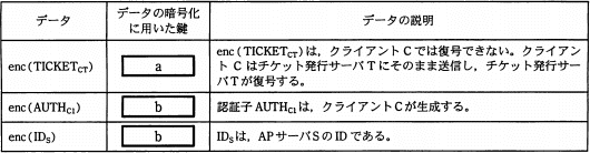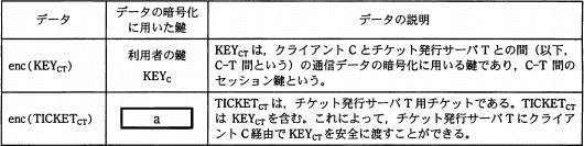 またenc(TICKETCT)は、チケット発行サーバTにチケット発行を依頼するためのチケットとC-T間で暗号化通信を行うための「KEYCT」を含み、クライアントCでは復号できずチケット発行サーバTが復号するとあります。