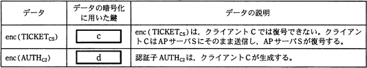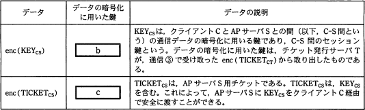 また、「enc(TICKETCS」は、APサーバSへのチケットと共にC-S間で安全に通信を行うための「KEYCS」を含み、「クライアントCでは復号できずAPサーバSで復号される」とあります。