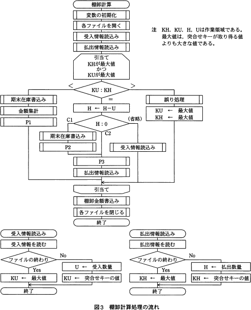 P2で「受入情報読込み」を行うと、P3でも再度「受入情報読込み」を行うことになってしまうため、受ファイルのレコードを一つ抜かしてしまうことになります。P3を処理なしにしてP2だけ「受入情報読込み」を行った場合は、H=0の時に「払出情報読込み」しか行わないということになってしまうので適切ではありません。