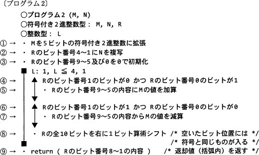 プログラム2が受け取るM,Nは,いずれも4ビットで,各値の範囲は -8~7である。求めた積M×Nは,8ビットで返す。ただし,プログラム2中では,Mを5ビットに拡張して処理を行う。