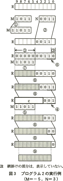 アルゴリズムの流れを示す図3「プログラム2の実行例(M=-5、N=3)を参考に空欄に入るビット列を考えていきます。