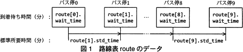 - route[i].std_time(i=1,2,…,9)は,前のバス停(i-1)からこのバス停iまでの 標準所要時間である。バス停0における route[0].std_time の値は0とする。