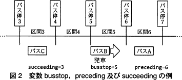 - busstop が示すバス停を直前に発車したバスが走行中の区間番号を格納する。busstop が示すバス停からバス停 9 までの区間に走行中のバスがない場合は9とする。