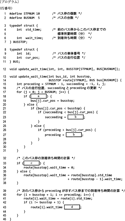 サービス向上のため,路線上のそれぞれのバス停に取り付けられた表示装置に,到着待ち時間に加えて,そのバスの運行遅延時間を分単位で表示することにした。そのために,関数 update_wait_time に,各バス停に表示する運行遅延時間を計算する処理を追加する。ここで,プログラム中のa~dには,正しい答えが入っているものとする。