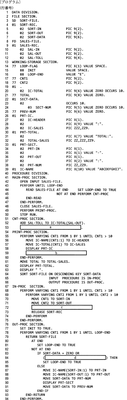 次のCOBOLプログラムの説明及びプログラムを読んで,設問1,2に答えよ。