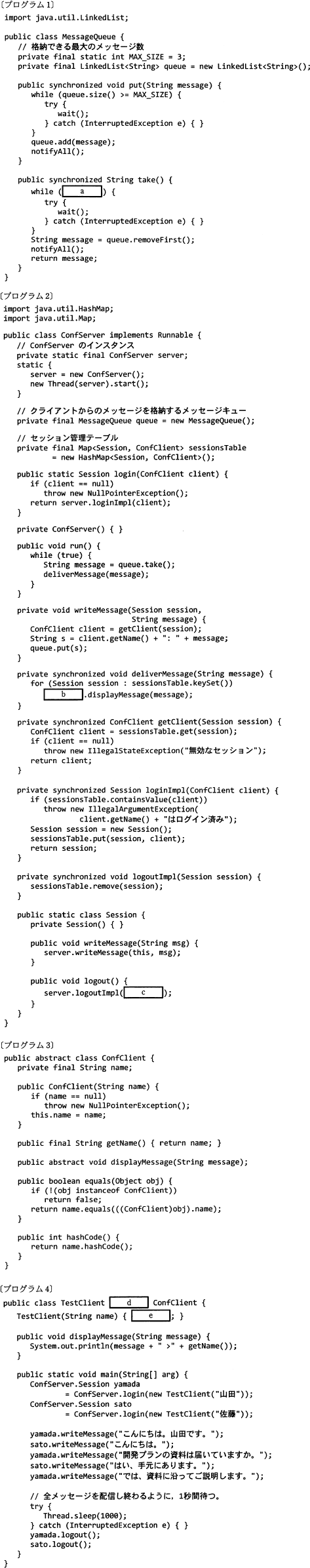クラス MessageQueue のメソッド put 及び take には,synchronized修飾子が付けられている。これには理由が二つある。一つは,キューの状態(空又は満杯)によってスレッド間でメソッド wait 及び notifyAll を 呼び出して同期を取るためである。もう一つの理由として適切な答えを,解答群の中から選べ。