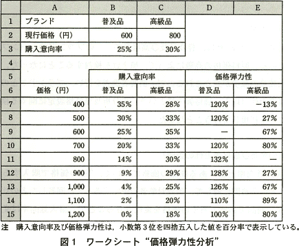ブランドごと価格ごとの価格弾力性を計算するためのワークシート"価格弾力性分析"を作成した。そのワークシートを図1に示す。