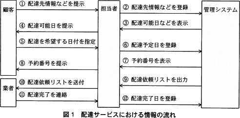 - 業者は,配達予定日の前日に,配達すべき家具と配達依頼リストを担当者から受け取る。配達予定日に配達先住所に家具を届け,配達完了を担当者に連絡する。