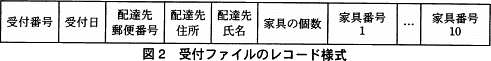 - 受付ファイルには,顧客から配達の依頼があったときに付与される一意の受付番号とともに,住所など配達に必要な顧客の情報を登録する。受付ファイルのレコード様式を,図2に示す。