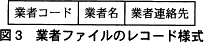 - 業者ファイルには,業者コード,業者名及び業者連絡先が登録されている。業者ファイルのレコード様式を,図3に示す。