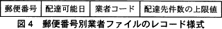 - 郵便番号別業者ファイルには,ある配達可能日にその郵便番号が示す地域に家具を配達可能な業者と,その業者がその日に配達可能な件数の上限値を登録する。郵便番号別業者ファイルのレコード様式を,図4に示す。ここで,一つの業者は一つの地域だけを対象とする。