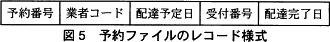 - 予約ファイルには,配達予定日が確定したときに付与される一意の予約番号とともに,業者コード,配達予定日及び受付番号を登録する。配達完了日には,配達完了までは空白が格納されており,配達が完了するとその日付が格納される。予約ファイルのレコード様式を,図5に示す。