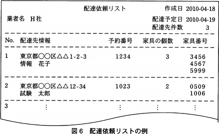 - 配達依頼リストは,業者が家具を配達する際に用いるリストであり,業者名,顧客への配達予定日,その業者の配達先件数,配達先情報,予約番号,家具の個数及び家具番号が記載されている。顧客への配達予定日の前日に,業者コード順に管理システムから出力される。配達依頼リストの例を,図6に示す。