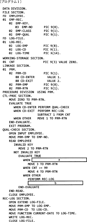 次のCOBOLプログラムの説明及びプログラムを読んで,設問1~3に答えよ。