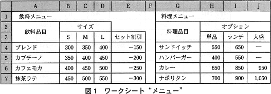 - この喫茶店の飲料,料理を記載した表計算ソフトのワークシート"メニュー"を作成した。そのワークシートを図1に示す。
