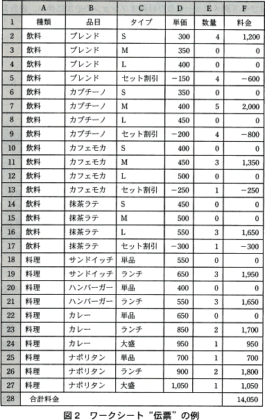 - 注文された飲料及び料理の数量の入力によって,料金計算を行うためのワークシート"伝票"を作成した。そのワークシートの例を,図2に示す。