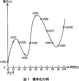 標本化では,時間的に連続したアナログ信号である電圧を一定の時間間隔で測定する。図1では,時間軸を t0,t1,… と等間隔dで区切り,各時刻での電圧を v(t0),v(t1),… と表す。