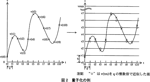 すなわち,図2右のように電圧軸を刻み幅qで v0,v1,…,vmax の電圧に分割しておき,v(t0),v(t1),… のそれぞれについて,v0~vmaxのうちで最も近い電圧を測定値とする。例えば,v(t3)の測定値はv2となる。