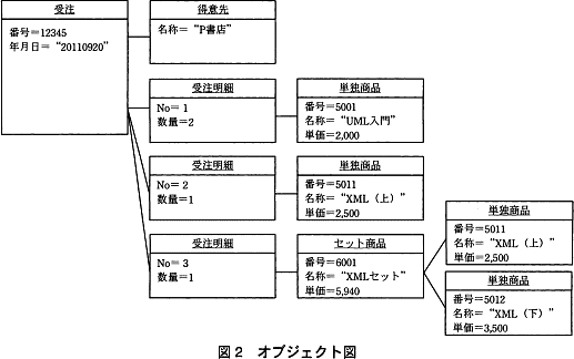 図2は,P書店から"UML入門"を2冊,"XML(上)"を1冊,"XML(上)"と"XML(下)"のセット商品"XMLセット"を1セット受注したときのオブジェクト図である。