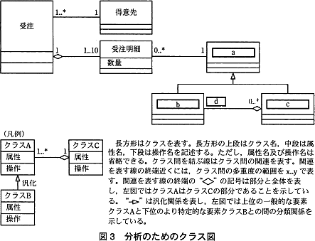 次に,クラス抽出と多重度を検討して,図3に示す分析のためのクラス図を作成した。多重度とは,一方のクラスの一つのオブジェクトに対して接続されている,他方のクラスのオブジェクトの個数を示すものである。