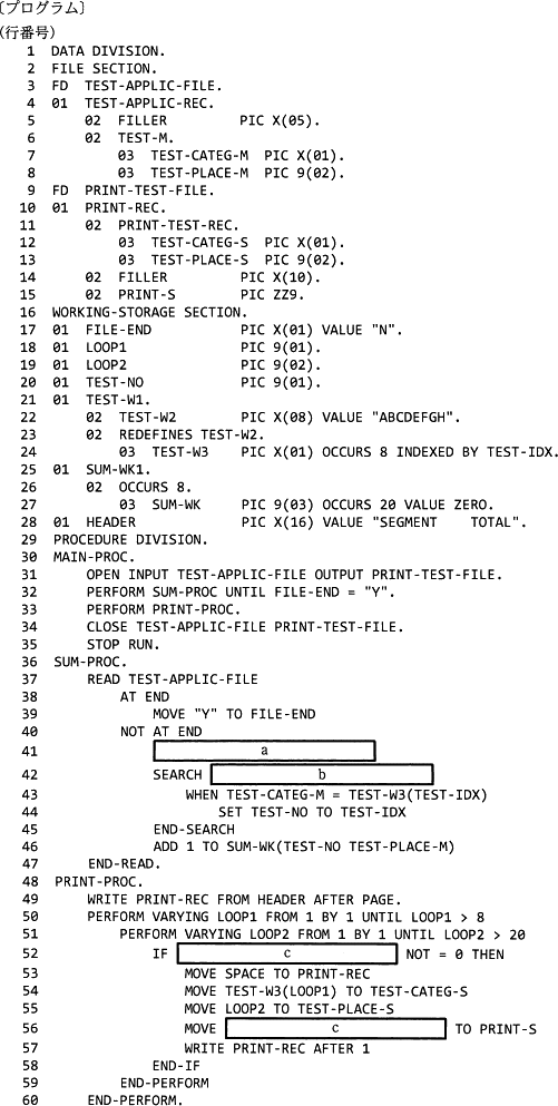 次のCOBOLプログラムの説明及びプログラムを読んで,設問1,2に答えよ。