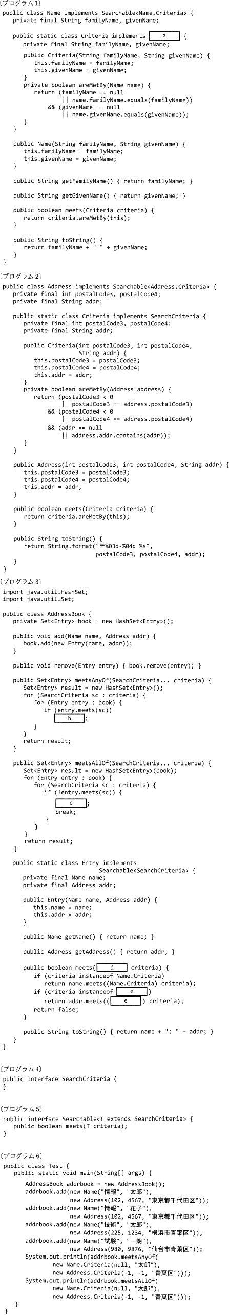 - クラス Address は,インタフェース Searchable を実装する。メソッド meets は,引数で与えられた criteria で実装されたメソッドを呼び出し,このクラスのインスタンスが検索条件に合致するかどうか調べる。