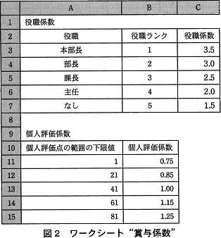 賞与の計算の基となる役職ごとの役職係数及び個人評価点に対応した個人評価係数を登録した図2のワークシート"賞与係数"を作成した。