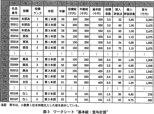 K社の三つの本部(第1本部,第2本部,第3本部)に所属する社員107名の基本給及び賞与を 計算するためのワークシート"基本給・賞与計算"を作成した。そのワークシートを図3に示す。