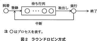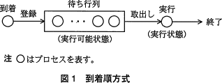 到着順方式を図1に示す。待ち行列に登録されているプロセスの状態を実行可能状態,実行中のプロセスの状態を実行状態と呼ぶ。