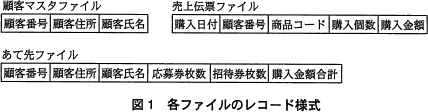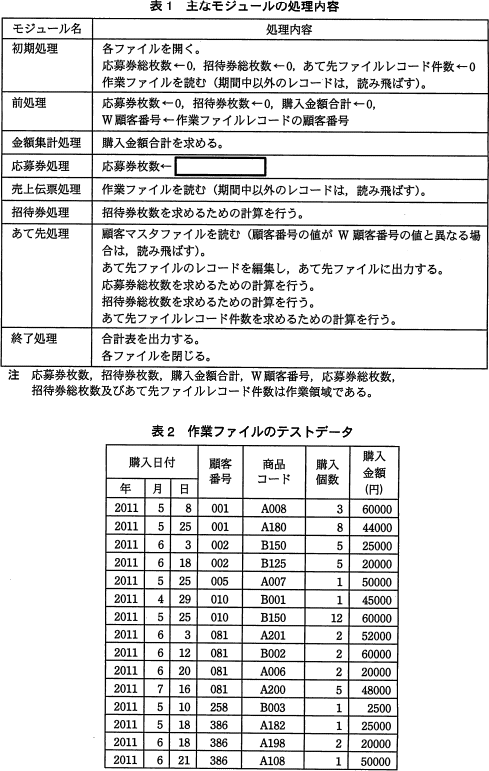 このたび,2011年5月10日から6月20日までの販売促進キャンペーン期間中(以下,期間中という)の顧客の購入状況に応じて,懸賞応募券(以下,応募券という)と催物招待券(以下,招待券という)を郵送することになった。そこで,売上伝票ファイルから応募券と招待券を送る顧客を選び,あて先ファイルを出力するあて先作成プログラムを作成することにした。