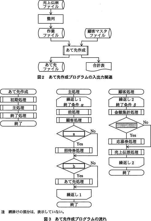 顧客マスタファイルは,顧客番号の昇順に整列されている。売上伝票ファイルを,顧客番号の昇順に整列した作業ファイルを作り,このプログラムに入力する。このプログラムの入出力関連を図2に,プログラムの流れを図3に,主なモジュールの処理内容を表1に示す。また,このプログラムのテストに用いる作業ファイルのテストデータを表2に,このテストデータを用いた場合の合計衰の出力結果を図4に示す。