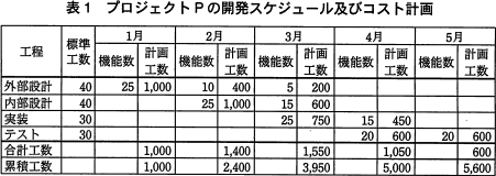 - プロジェクトPでは40個の機能の開発が必要であり,その開発スケジュール及びコスト計画は,表1のとおりである。