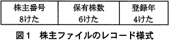 - 株主ファイルは,2011年3月31日に作成した株主一覧に登録されている個人株主を 対象に作成した,図1に示すレコード様式の順ファイルである。