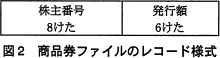 - 商品券ファイルは,図2に示すレコード様式の順ファイルである。発行額には,各株主に対する商品券の発行額を設定する。発行額は,表1に示す決定表によって決まる。