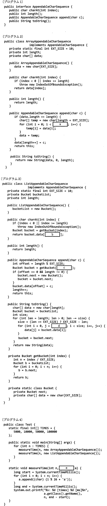 クラス ArrayAppendableCharSequence 及び ListAppendableCharSequence は,追加可能な0個以上の文字からなる文字列(文字の並び)を表現するインタフェース AppendableCharSequence を異なるデータ構造で実装したプログラムである。